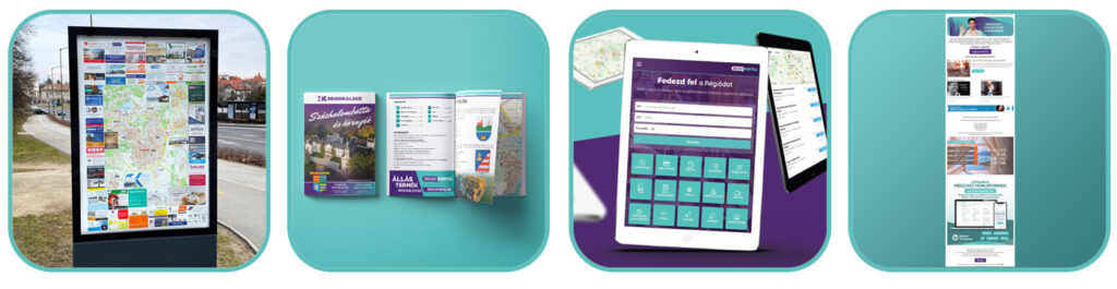 Tartalomfókuszú céginformációs plakát térképeken és információs magazinokban helyezzük el partnereink reklámjait, PR megjelenéseit. A grafikai feladatokat is mi látjuk el, felügyeljük a gyártást és részt veszünk a lokális terjesztésben is.